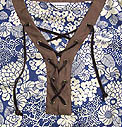 胸元に深いスリットあきの入ったブラウス。 スウェードリボンが秋らしい。 春夏にあった甘めのリバティとは違う、 クールな色合いも魅力です。