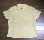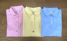 色鮮やかなシャンブレーのシャツ。 リバティ生地でできたくるみボタン、 1つ1つの柄が違ったりして 「こんなシャツがあればなぁ」 と思い描いていたシャツです。