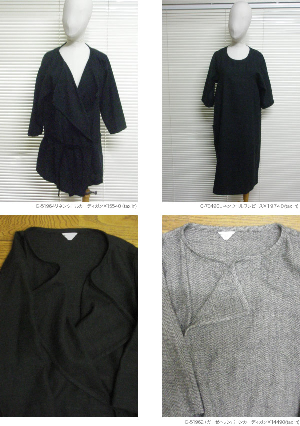 ノーボタンで、どちらかといえば形状はガウンに似ています。ロングカーディとストールと薄手コートの良いとこ取りとでも言えるフィーリングで仕上がっており、前を肌蹴て着ても不思議と身頃が、エレガントな流れをつくりだしてくれます。 サラウェアは意外と季節の変わり目アイテムが、手薄だったりするのですが、今年は大丈夫ですよ〜 ウールガーゼ、リネンウール、ガーゼヘリンボーンと三素材用意しています。