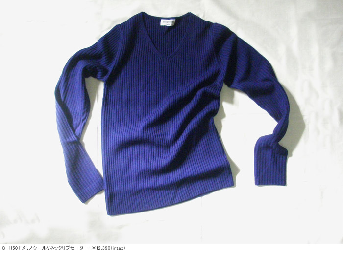 そしてこの商品、カラーバリエーションだけだはなく着た時のサイズ感にもこだわりました。 リブニットとは伸び縮みする編み方で、体にフィットします。 しかし糸のテンション ( 張り ) が強すぎると逆に締め付けられきつく感じてしまいます。体に心地よ くフィットする丁度いい具合をニット工場と相談し作りました。生地には最高級メリノウールを使用 し、胸元のVネックの開き具合がきれいなラインが出るように工夫しました。