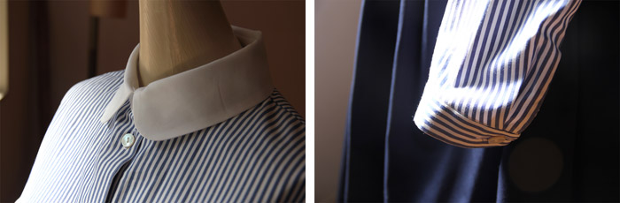 今回は丸衿のクレリックシャツの紹介です。洋服の形はスタンダードなシルエットで少しだけ細身のつくり、高めの衿が上品な雰囲気を醸し 出します。 コットンの生地はオーソドックスなものを使用、幅の狭いカフス部分が少女のような印象です。