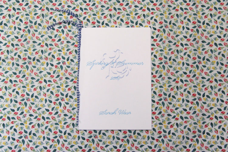 2014Spring&Summer のカタログが完成しました。 フランスのトラッドスタイルをベースに16のコーディネートを掲載しています。 製本方法は、洋服に使用した生地の紐で手結びで閉じています。たくさんの種類の生地を使用しているので どんな生地の紐に当たるかはお楽しみです。