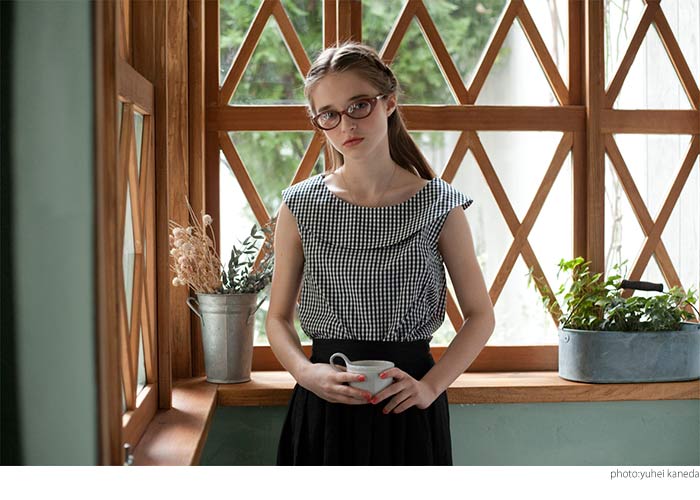 張りのあるコットン生地は爽やかな印象で少女のようなスタイルに、