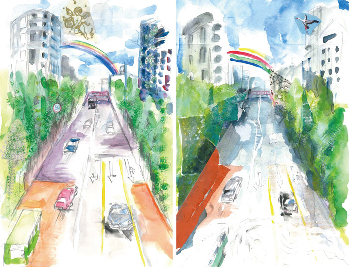 デザイナーがおなじ風景で2枚の絵を描きました。